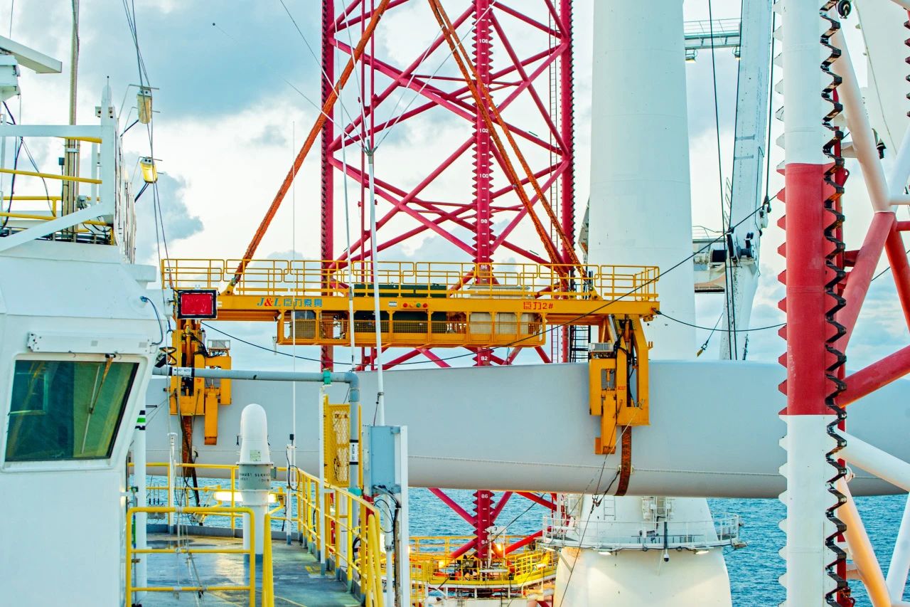 2021年8月19日,華能山東半島南4號海上風電項目順利完成首臺風機“整體”吊裝,風機整體最大重量為650噸,該吊裝設備包括運輸底座、井字架、平衡梁、電氣系統、液壓系統、緩沖系統等部件構成,是巨力索具在北方沿海地區海上風電首個風機整體吊裝項目。開創了國內海上風電實施5.0兆瓦以上單樁基礎風機整體吊裝先河。