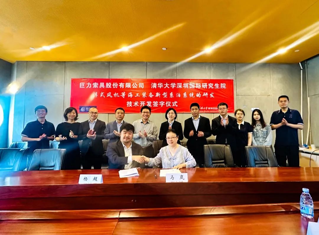 2023年4月13日,巨力索具與清華大學深圳國際研究生院就浮式風機等海上漂浮式構筑物新型系泊系統的研發達成技術開發合作關系并舉行簽約儀式。
