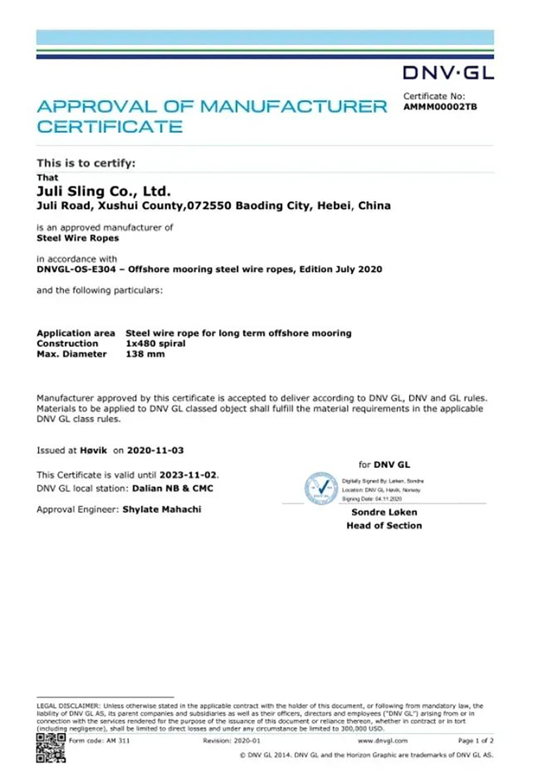 2020年11月,巨力索具取得了永久系泊用單股涂塑鋼絲繩的DNV·GL工廠認(rèn)可證書,成為國(guó)內(nèi)首家通過該類鋼絲繩DNV·GL工廠認(rèn)可的廠家。