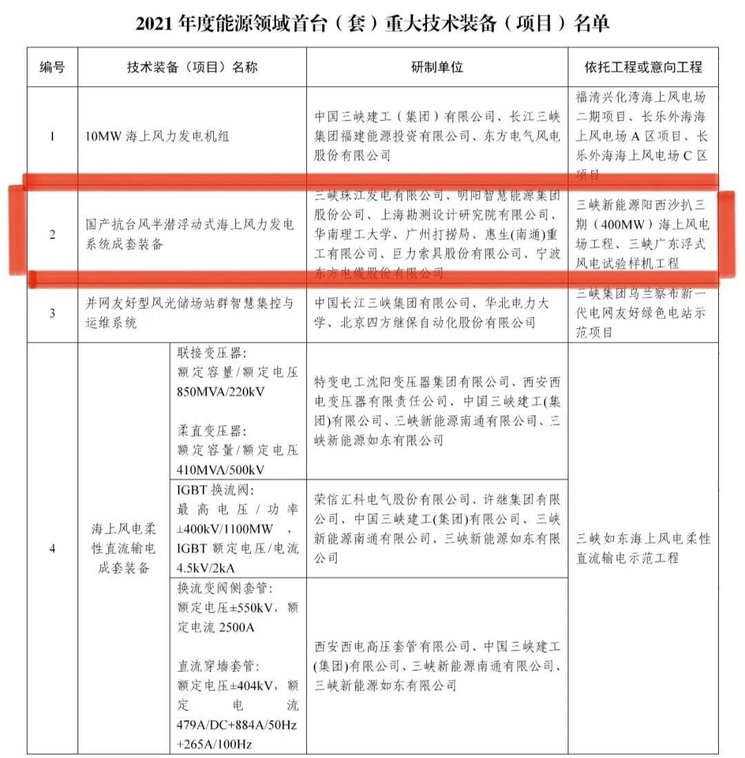 2022年5月13日,國(guó)家能源局把巨力索具參與研制的國(guó)產(chǎn)抗臺(tái)風(fēng)半潛浮動(dòng)式海上風(fēng)力發(fā)電系統(tǒng)成套裝備列入國(guó)家首臺(tái)(套)重大技術(shù)裝備(項(xiàng)目)名單。